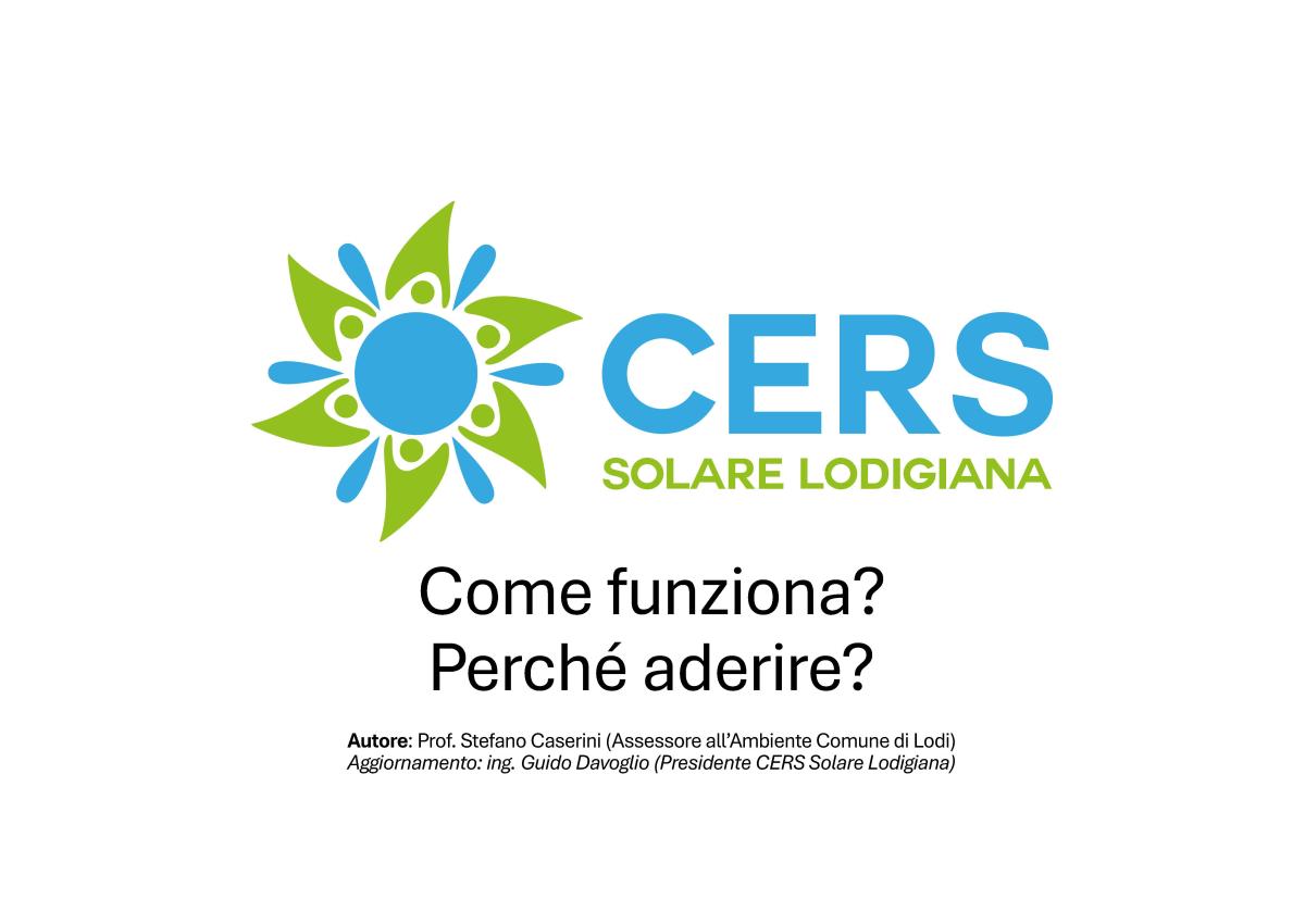 Presidente della CERS Solare Lodigiana è Guido Davoglio, vice presidente Elisabetta Capellini e consiglieri Giancarlo Geroni, Rocco Tinnirello e Edoardo Galatola. Ha sede presso il Comune di Lodi in Piazza Broletto 1.